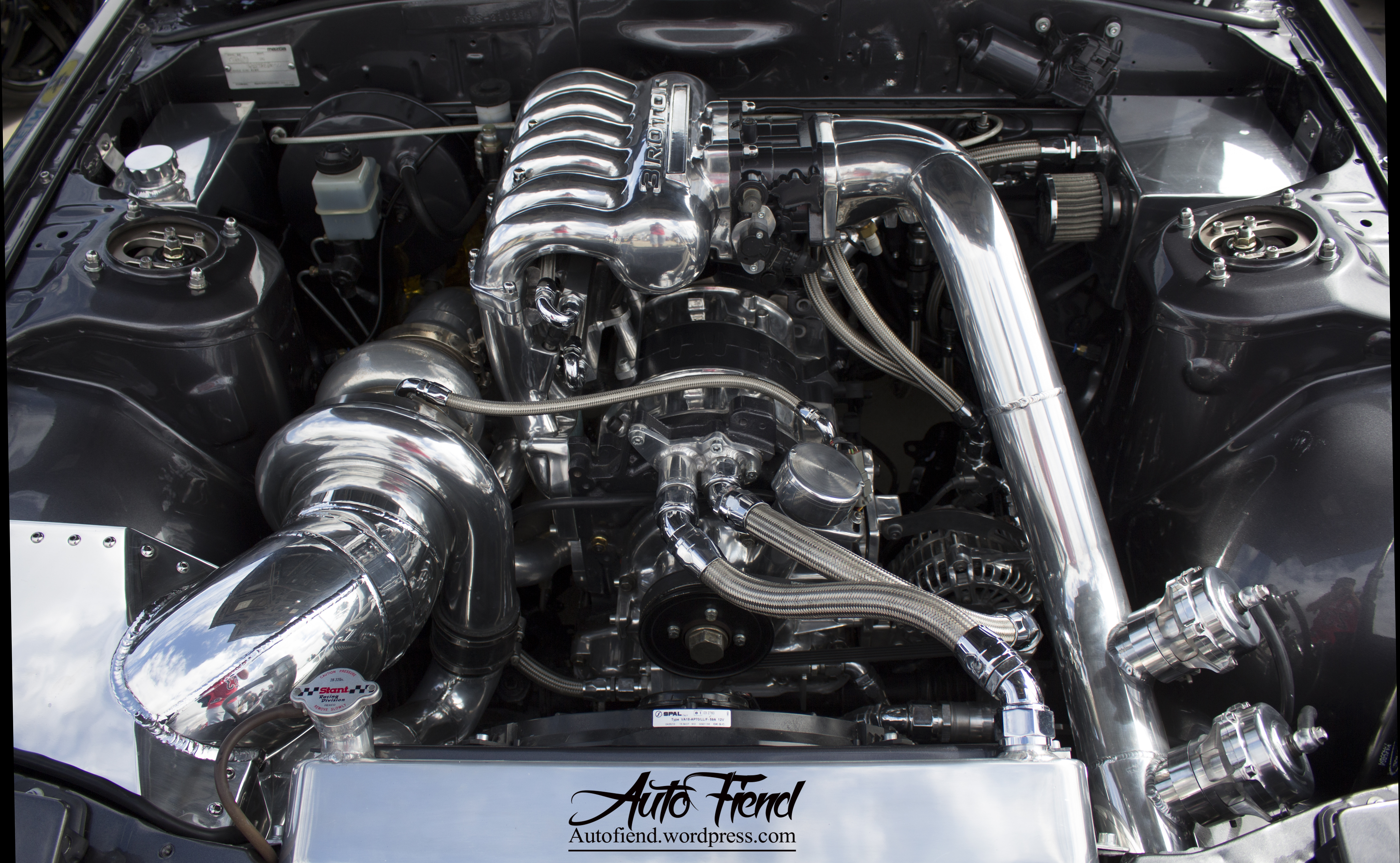 What an immaculate and extreme engine bay, The RX7 engine bay is now home to the sought after 20B triple rotor.
