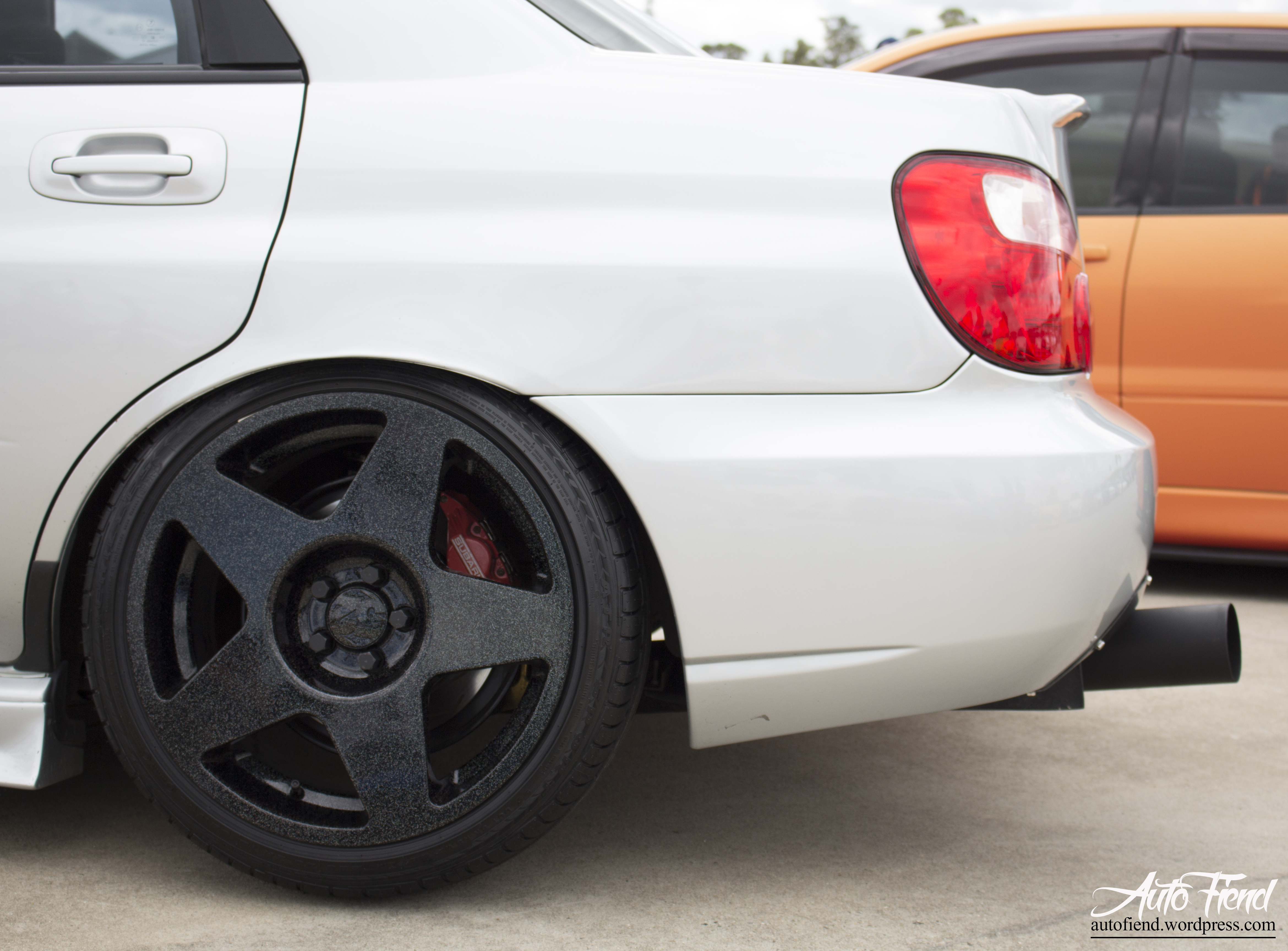 The only way to get a nice offset from the wheels on your WRX, add flares and fill them out. Such a clean example.