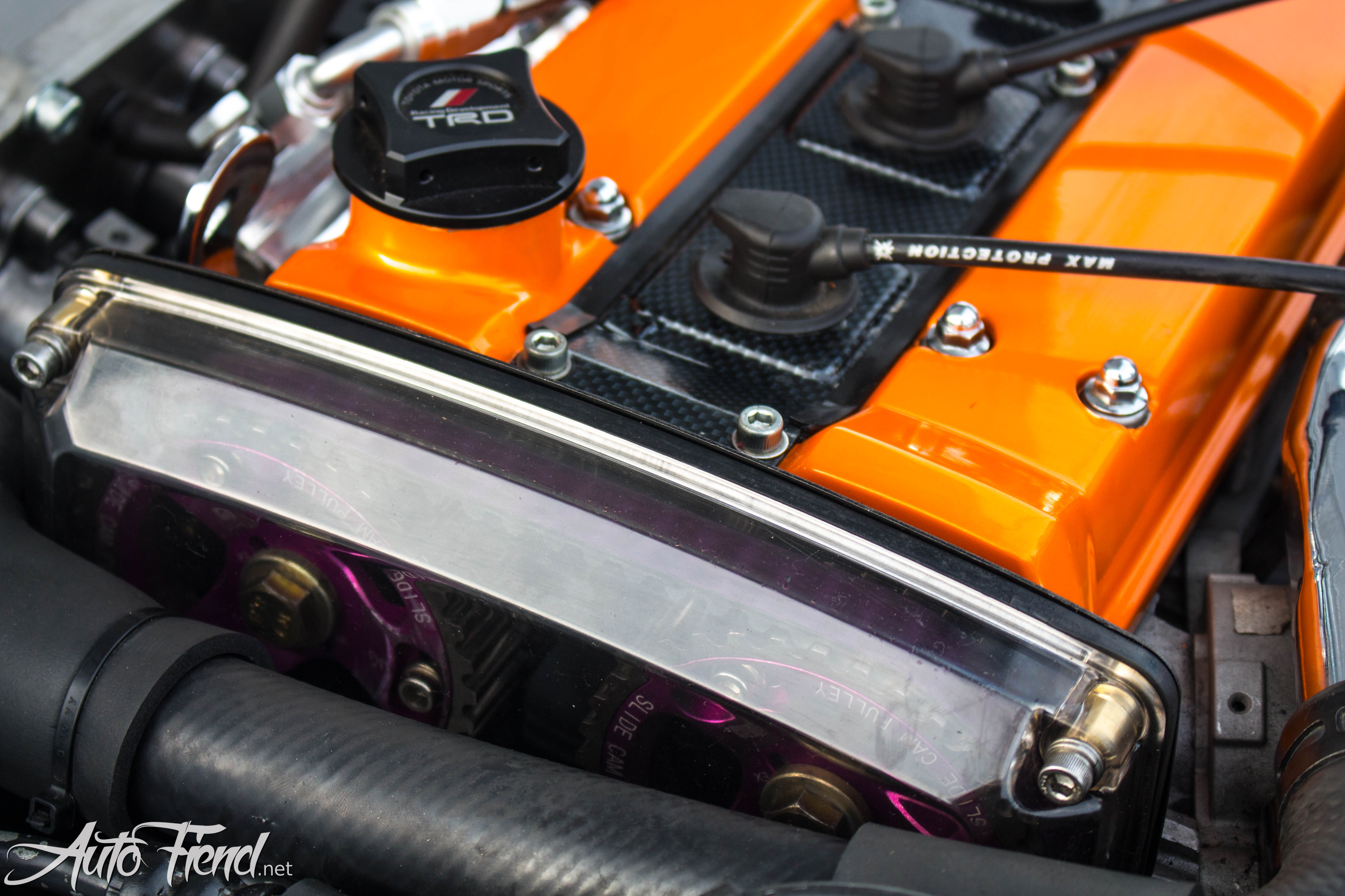 This detailed 4A-GE was powering one of the machines we are featuring in the next post. The perspex cover reveals a pair of HKS adjustable cam gears. The freshly painted cam covers demand attention compared to the hidden purple cam gears.