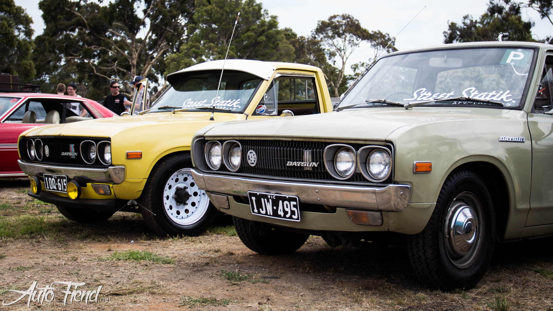 Parking your matching vehicles along side each other is a good way to highlight the differences within each, shown here with this pair of Datsun 620’s.